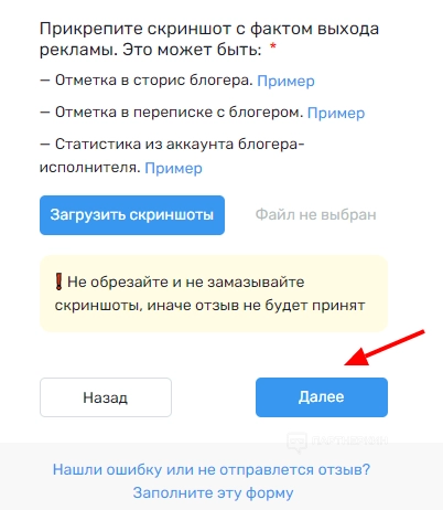 После того как пользователь заполнил требуемые поля и загрузил скриншоты, нужно перейти к заключительному шагу по кнопке «Далее».