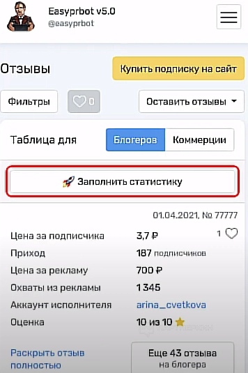 - по отзывам на сайте Easyprbot (если на инфлюенсера есть отзывы, то в результатах будет ссылка на их подборку, также в статистике отобразится средняя цена за подписчика и средняя оценка по результатам этих отзывов);