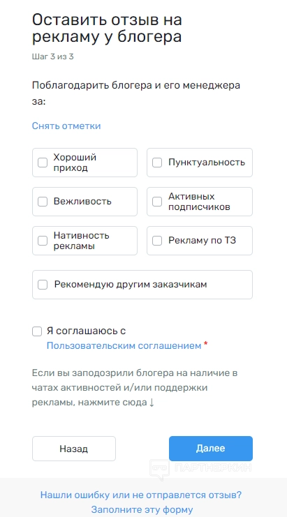 - оценка рекламы по шкале от 1 до 10 (если пользователь пишет негативный текст для отзыва, то каждое утверждение в нем должно быть подтверждено скриншотом. Без подтверждения модераторы не пропустят отзыв или опубликуют его без текста);