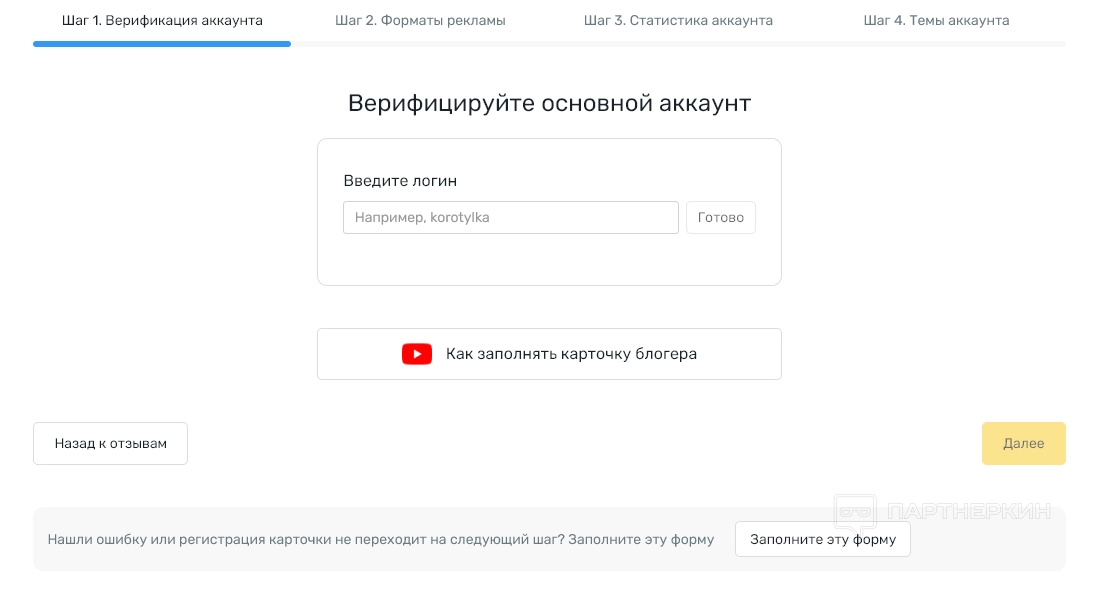 Шаг 1 . Верификация аккаунта. Во вкладке «Верификация аккаунта» необходимо ввести логин и нажать «Готово».