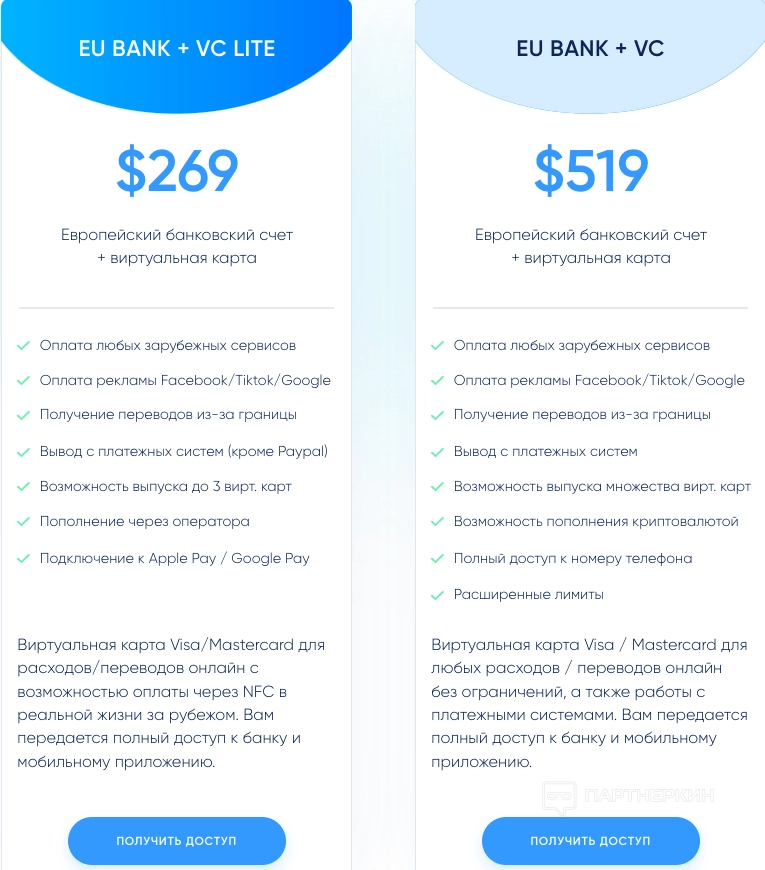 — до 5 виртуальных карт на тарифе «EU BANK + VC»; - Месячные лимиты по счету от €15 000 до €30 000 — зависит от тарифа, узнавайте детали в поддержке сервиса.