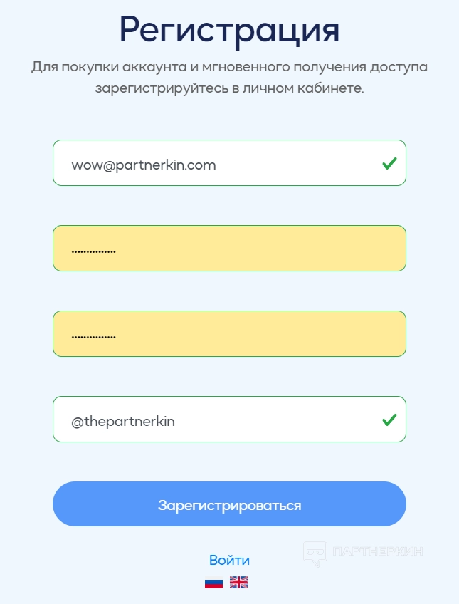 Моментальная выдача данных для входа и инструкций по работе.