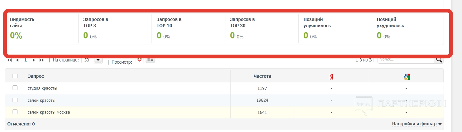 После установки настроек отчет обновится, и можно будет посмотреть данные — они распределены по трем разделам. Давайте тезисно рассмотрим результаты, которые выдает аналитика позиций сайта.