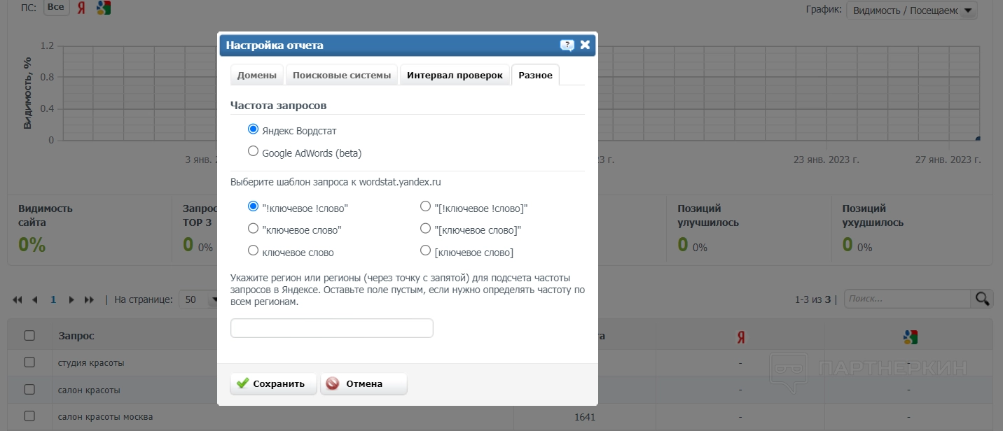 Разное — здесь пользователи могут указать, через какую систему будет проверяться частота запросов. Автоматически стоит Яндекс Вордстат, но можно изменить на Google Ad — важно знать, что Google Ad пока находится в стадии бета-тестирования. В этом же разделе настраивается формат запроса — то есть нужно установить, с помощью каких операторов будет совершаться проверка. Например, при поиске запроса в квадратных скобках будут искать только варианты с прямым вхождением — остальные система будет опускать. Это может серьезно повлиять на показатель частотности.