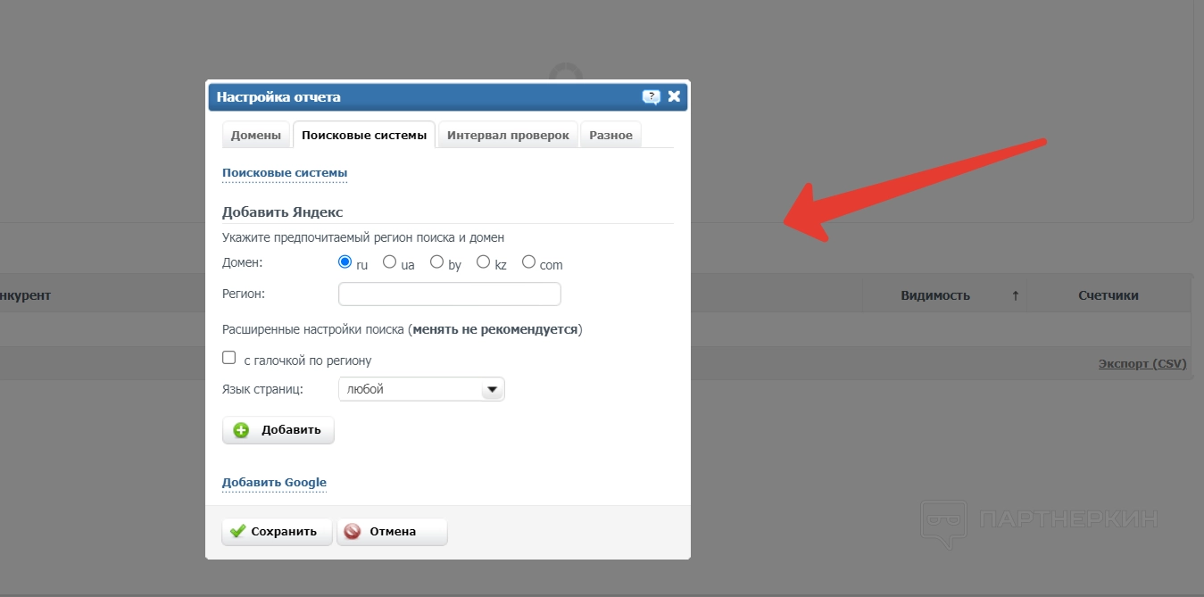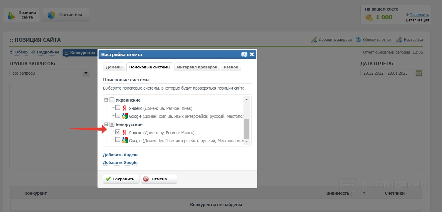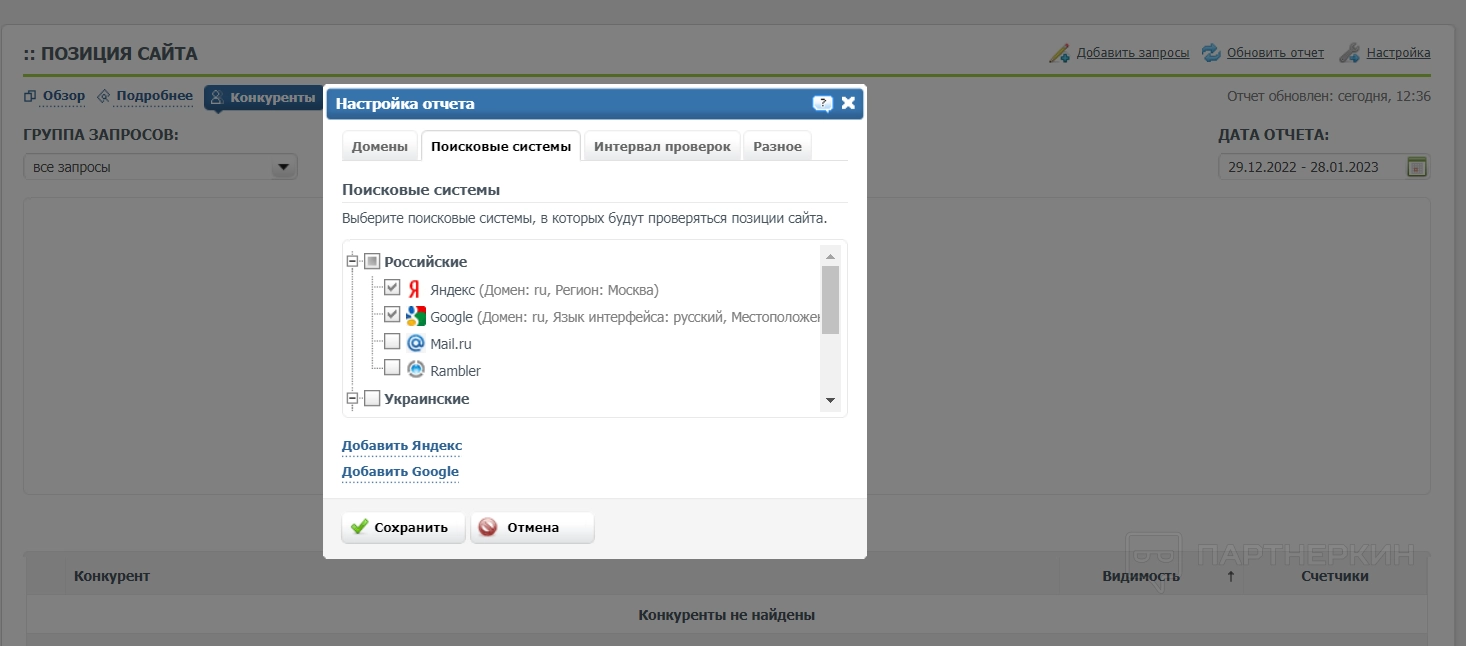 Поисковые системы — в этом разделе можно проставить, какие поисковые системы будут анализироваться для отчета. Поиск производится не только по Google или Яндекс, но и по mail.ru с Rambler. При этом можно отметить локализацию поисковика — например, выставить не российские, а белорусские.