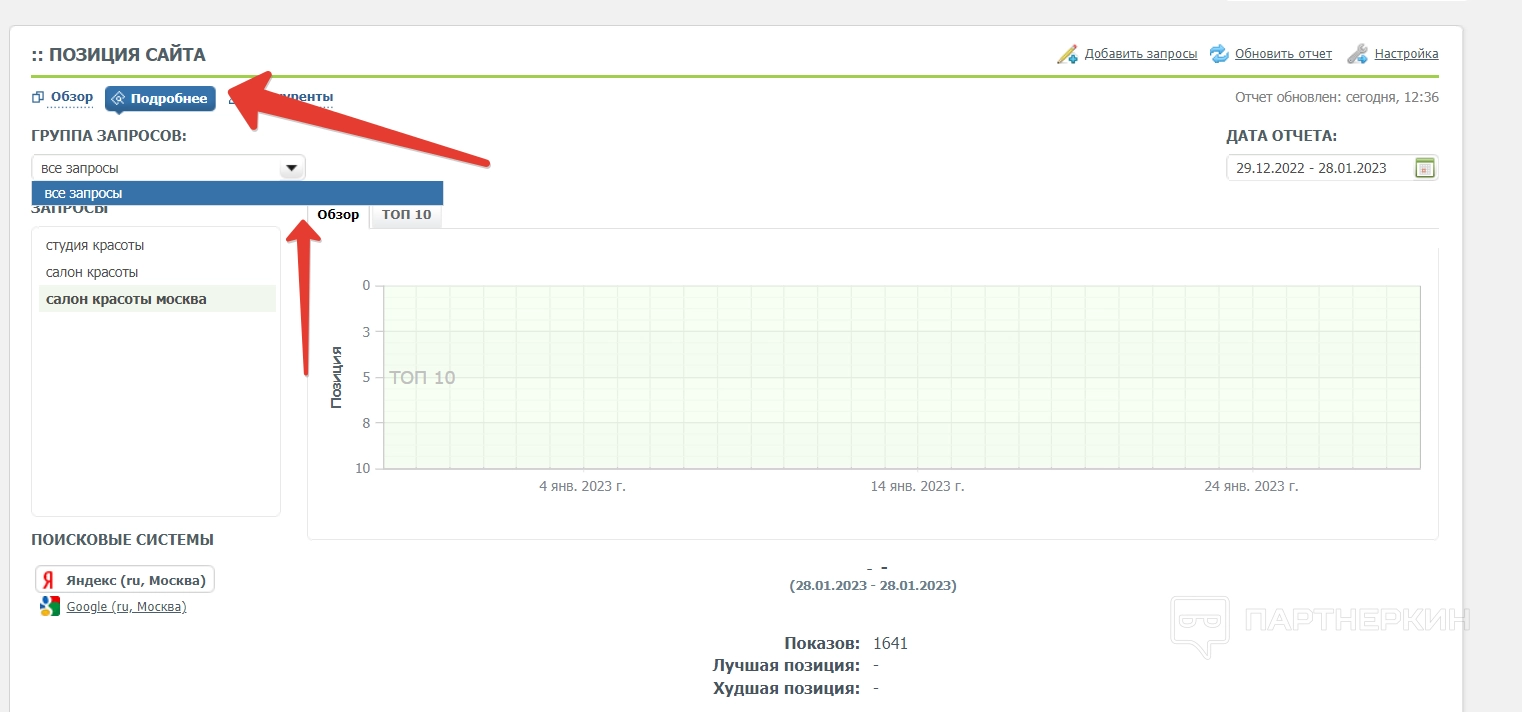 Подробнее — в этом разделе показывают более подробный график по запросам. В нем отмечается позиции в выдаче конкретных запросов, а также их частотность в общем. Если запросы расположили в другой группе, то ее можно сменить наверху страницы.