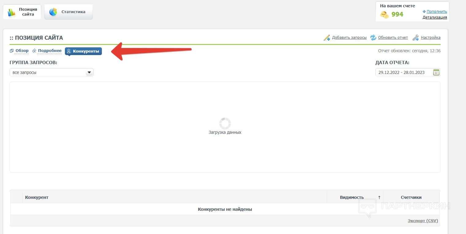 Конкуренты — это важный раздел, так как в нем анализируются конкуренты по запросам. Пользователи могут просматривать, по каким именно запросам идет конкуренция, с каким доменом, а также насколько высокая видимость у сайта конкурента, и какие счетчики он использует.