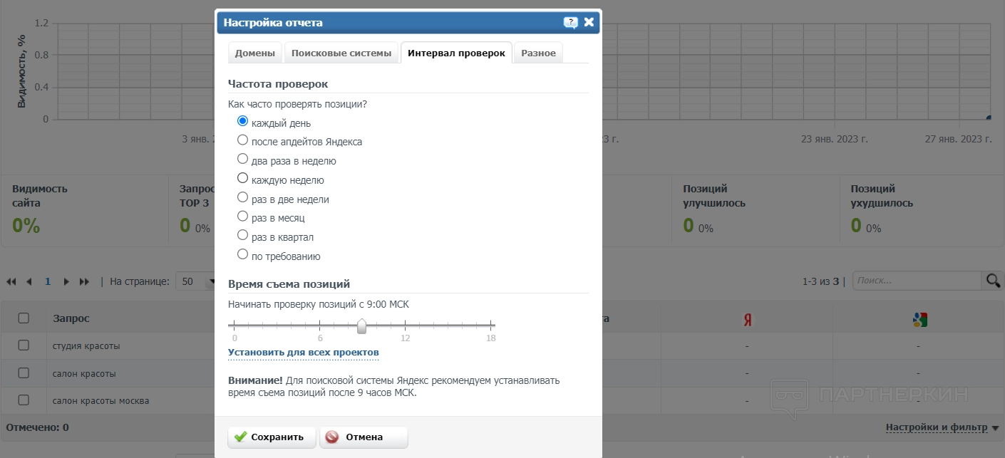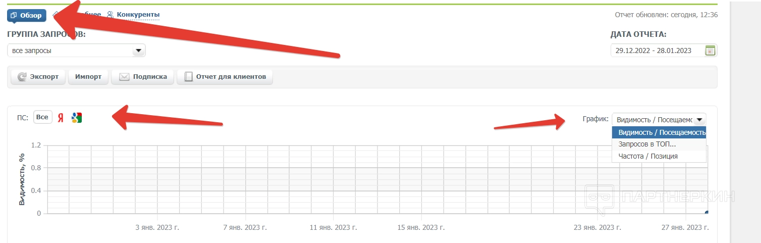 Также можно отметить, какое наполнение будет у графика — не только видимость и посещаемость, но и запросы в ТОП или частота и позиция.