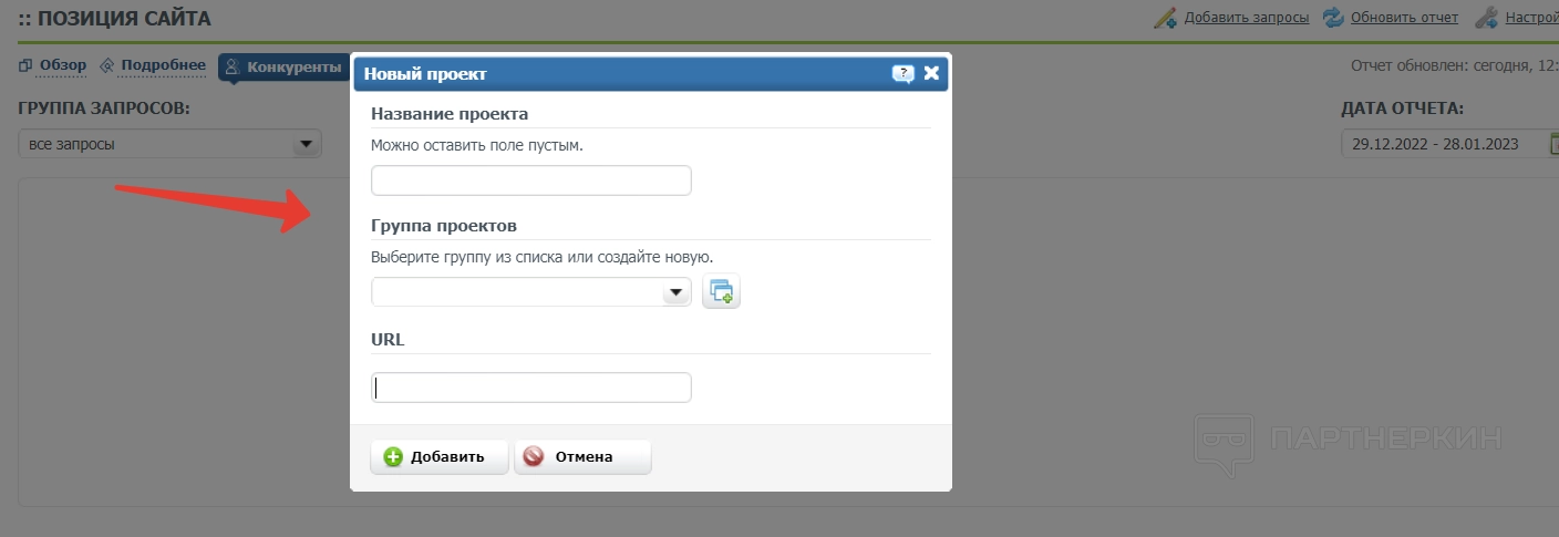 В процессе добавления проекта появится табличка, в которой указывается урл сайта, наименование проекта, а также группа проектов по необходимости.