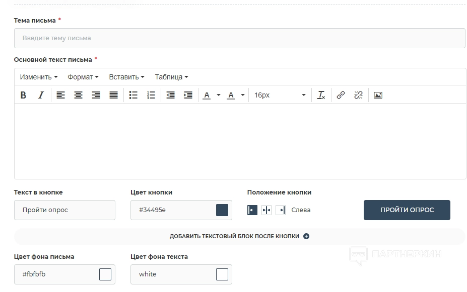 В следующем блоке настраиваем письмо. Для этого предусмотрен редактор, где можно менять настройки шрифта, добавлять медиафайлы и выбирать цвет для определенных элементов.