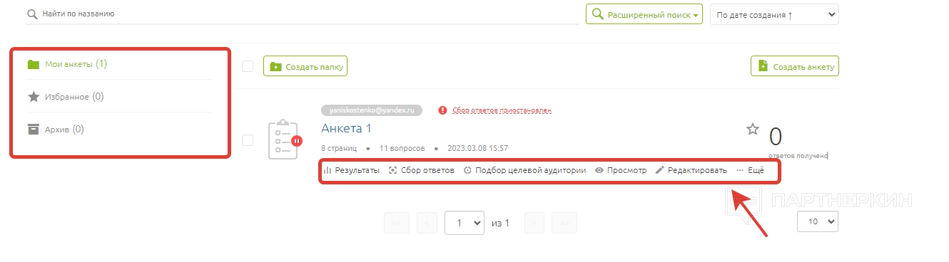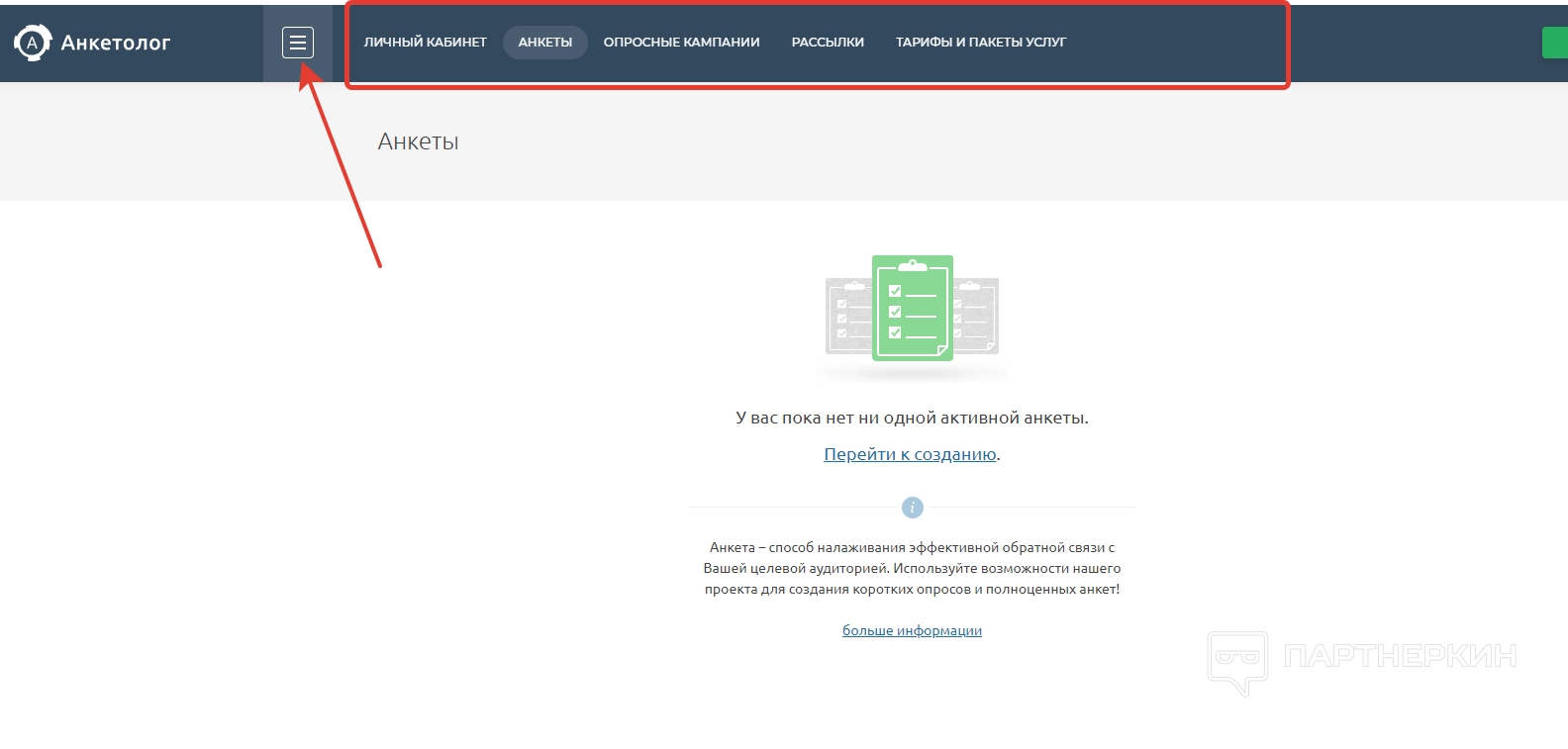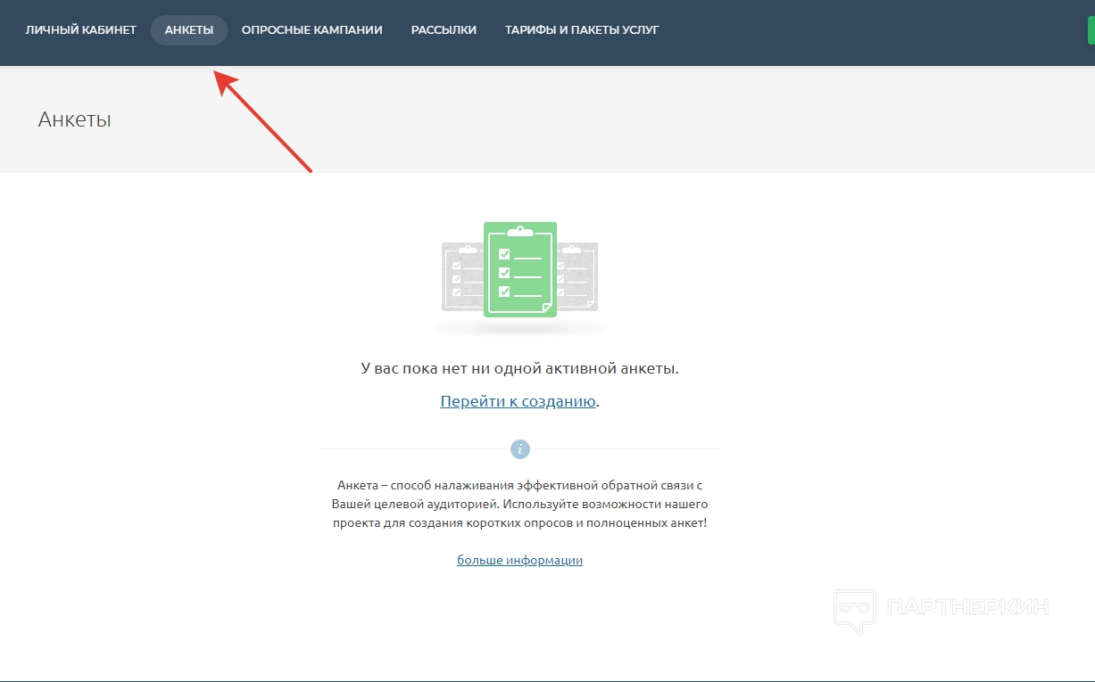 В этом разделе хранятся и создаются анкеты. Чтобы создать первую анкету, открываем блок и жмем на соответствующую кнопку в центре экрана.