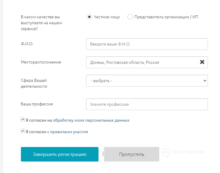 Для завершения регистрации необходимо заполнить анкету. Для этого тип лица (частное или ИП), Ф.И.О., месторасположение, сферу деятельности и свою профессию.