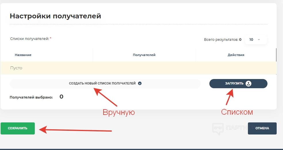 В последнем блоке указываем адреса получателей. Добавлять можно вручную по одному email или целым списком. В конце проверяем параметры и жмем «Сохранить».