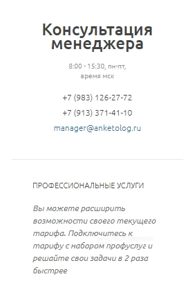 В правой части экрана пользователь найдет контактные данные и список профессиональных услуг, которые можно получить от представителей сервиса. К этим услугам относятся: