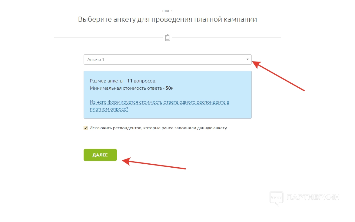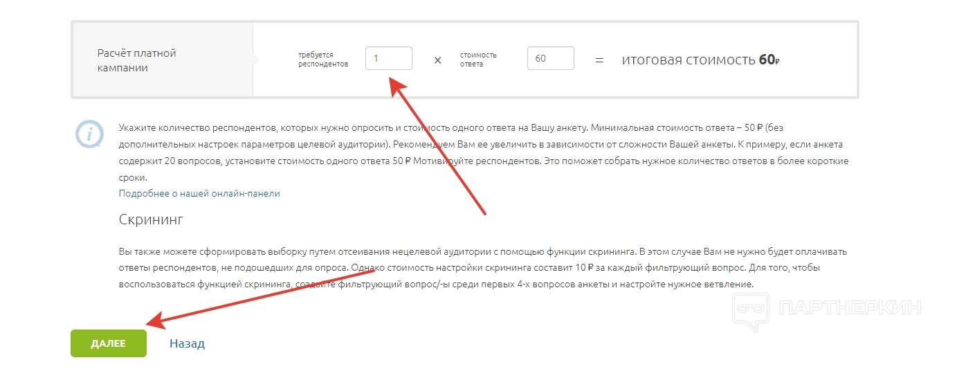 Учтите, что за каждый выбранный параметр к стоимости опроса прибавляется +10 рублей. Спускаемся в нижнюю часть страницы, указываем количество респондентов и жмем «Далее».