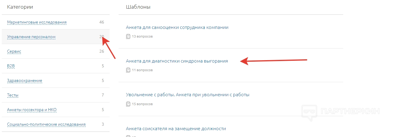 Воспользуемся шаблоном «Анкета для диагностики выгорания» из категории «Управление персоналом».