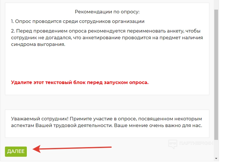 Когда пользователь выберет шаблон, откроется окно с рекомендациями по анкете. Кликнув на кнопку «Далее», можно ознакомиться с прикрепленными к анкете вопросами.