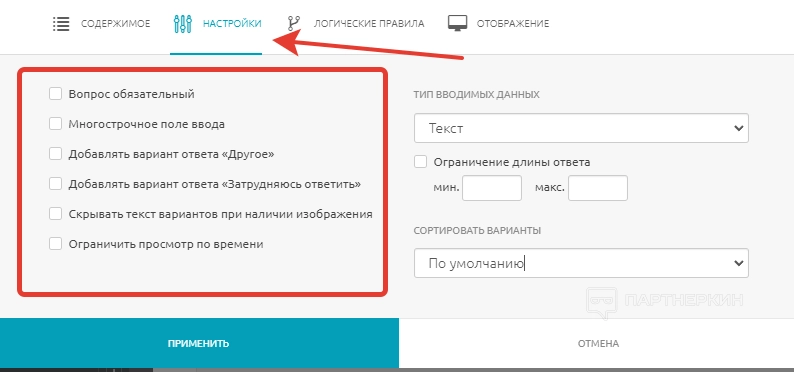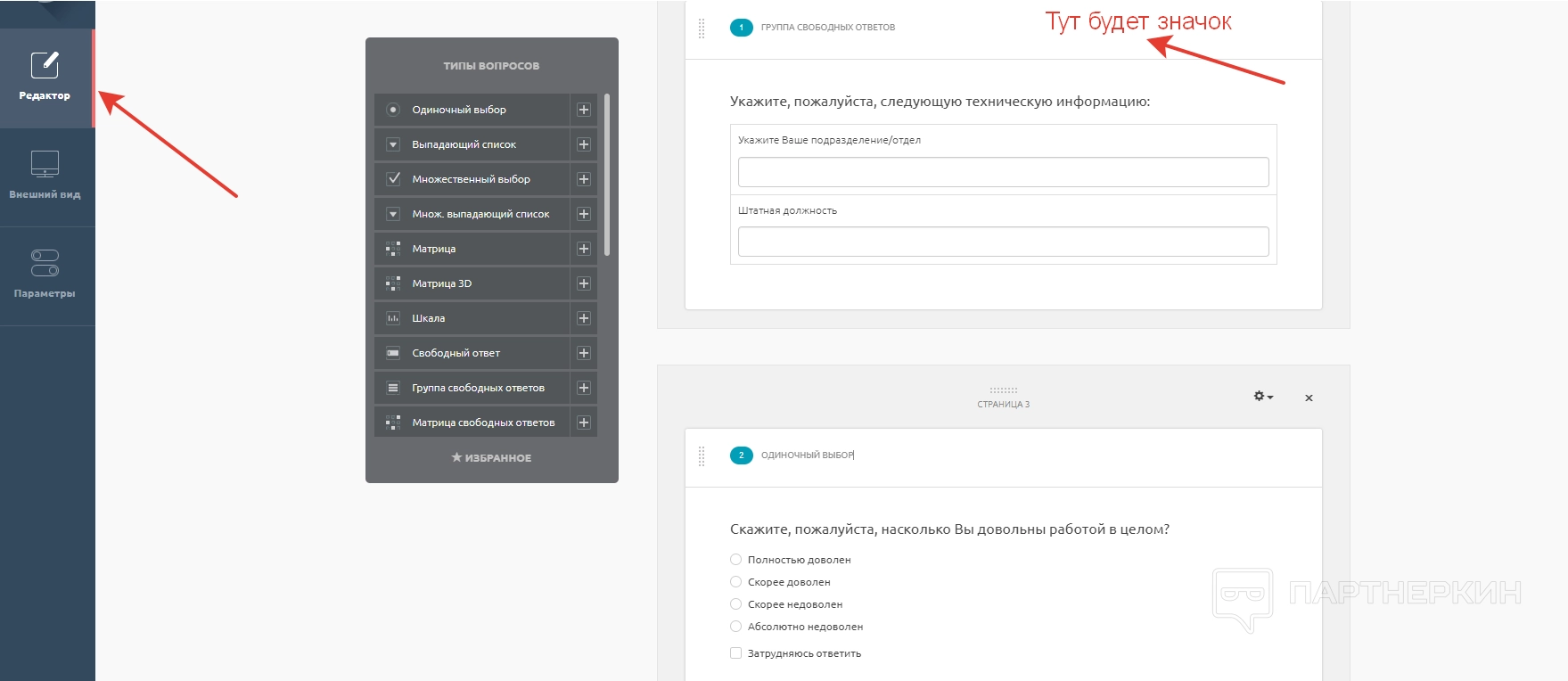 - редактор — здесь пользователь вводим вопросы, регулирует расположение блоков;