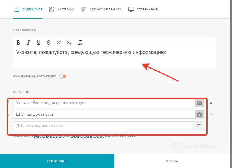 Откроется форма, в которой будет 4 вкладки. Во вкладке «Содержимое» указывается вопрос и варианты ответов. Для вписывания текста предусмотрен упрощенный редактор. При необходимости можно разрешить комментарии, фото и видео.