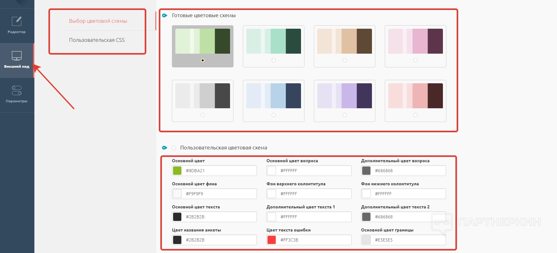 Чтобы настроить визуальное оформление, переходим в раздел «Внешний вид». Тут вебмастер может воспользоваться готовыми цветовыми схемами или установить цветовые параметры под каждый блок анкеты по своему усмотрению. Также есть возможность применения пользовательских CSS.