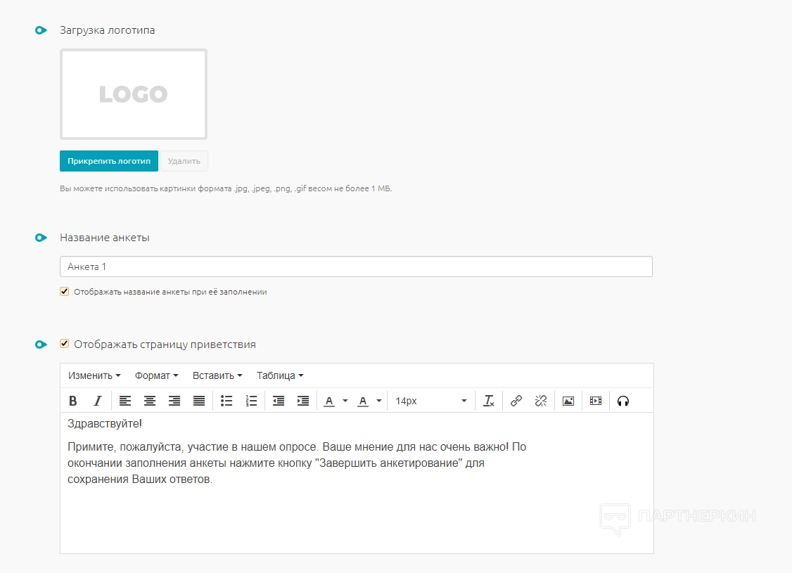 В разделе «Настройки» юзер может прикрепить к анкете логотип, а также прописать вступительную речь и прощание. Тут же задается название.