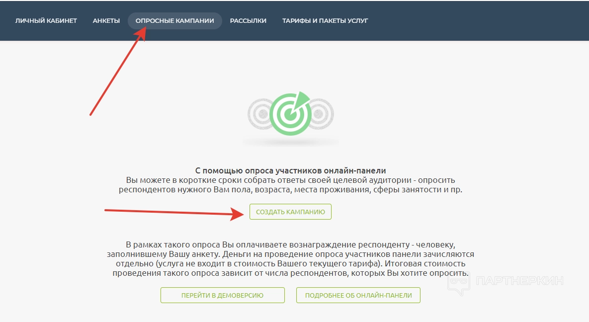 - Создать первую кампанию, используя раздел «Опросные кампании». Только для начала у пользователя должна быть первая анкета.