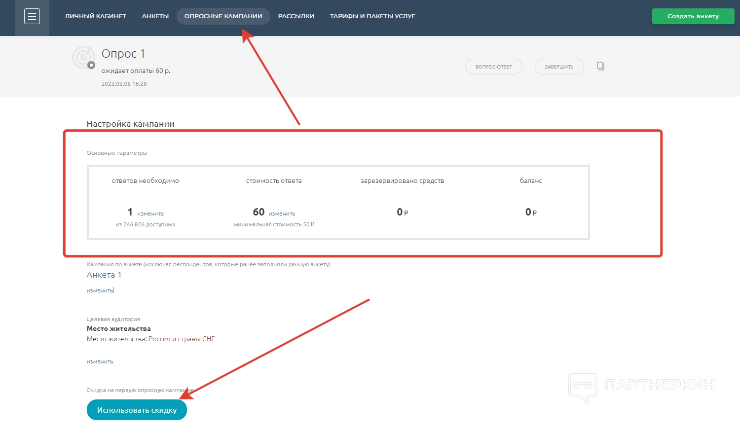 По завершении сверяем все данные и кликаем на кнопку «Создать кампанию. Готовый опрос с выбранными настройками отобразится в дашборде раздела «Опросные кампании». Обращаем внимание на кнопку «Использовать скидку», о которой шла речь в разделе «Личный кабинет».