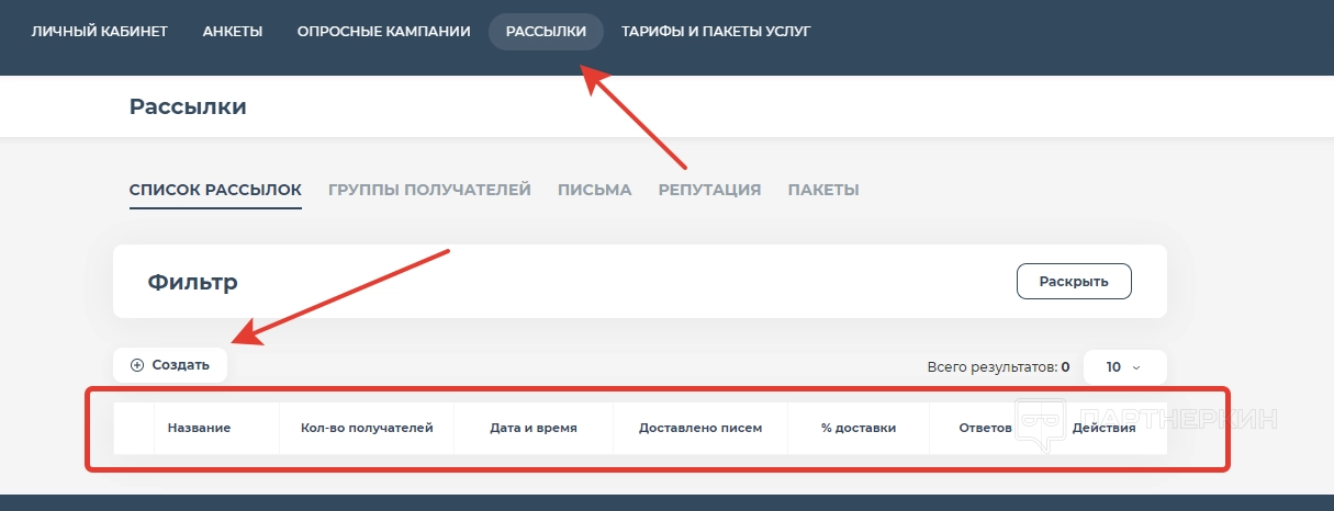 В этом разделе создаются рассылки для электронных почт. Сделать это можно, нажав на кнопку «Создать», которая расположена над панелью фильтрации.