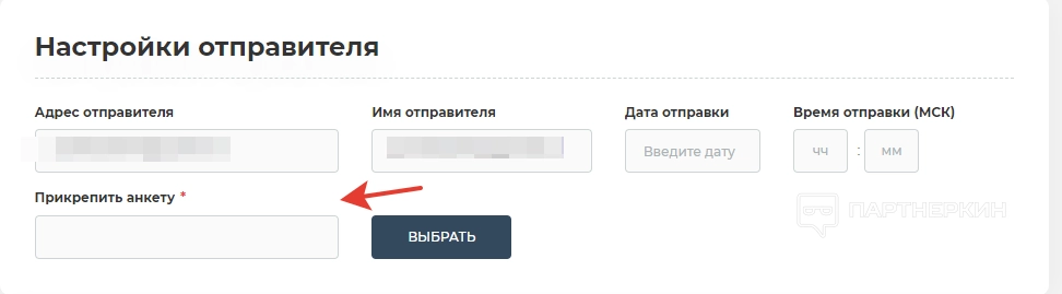 При создании рассылки пользователю нужно заполнить несколько блоков. В первом блоке указываем электронную почту отправителя (свою), свое имя, даты и время. Тут же прикрепляем анкету.