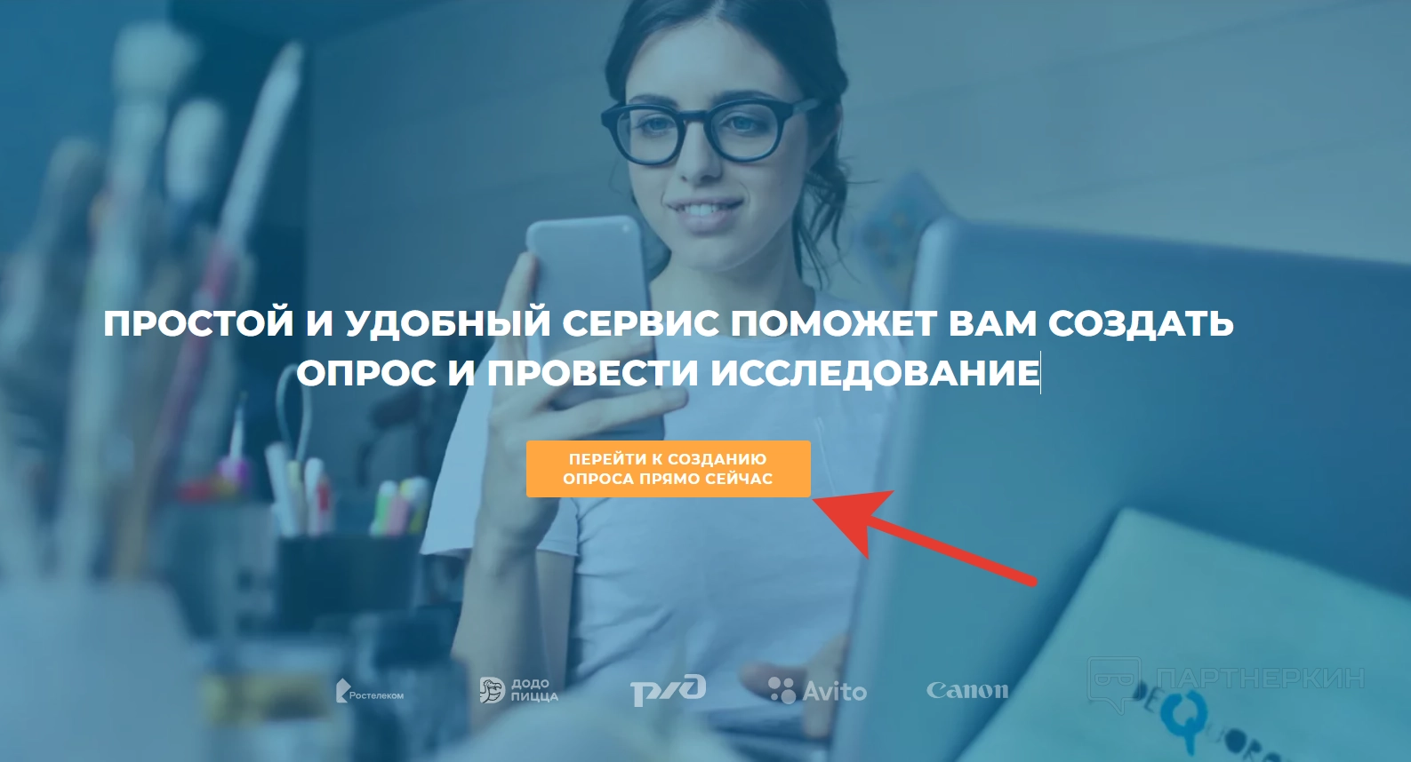 Чтобы начать работу с сервисом, заходим на официальный сайт и кликаем на «Перейти к созданию опроса прямо сейчас».