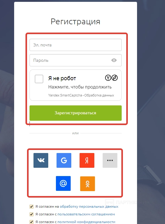 Для регистрации учетной записи нужно всего лишь указать электронную почту и пароль. Либо же пройти авторизацию, используя один из аккаунтов: