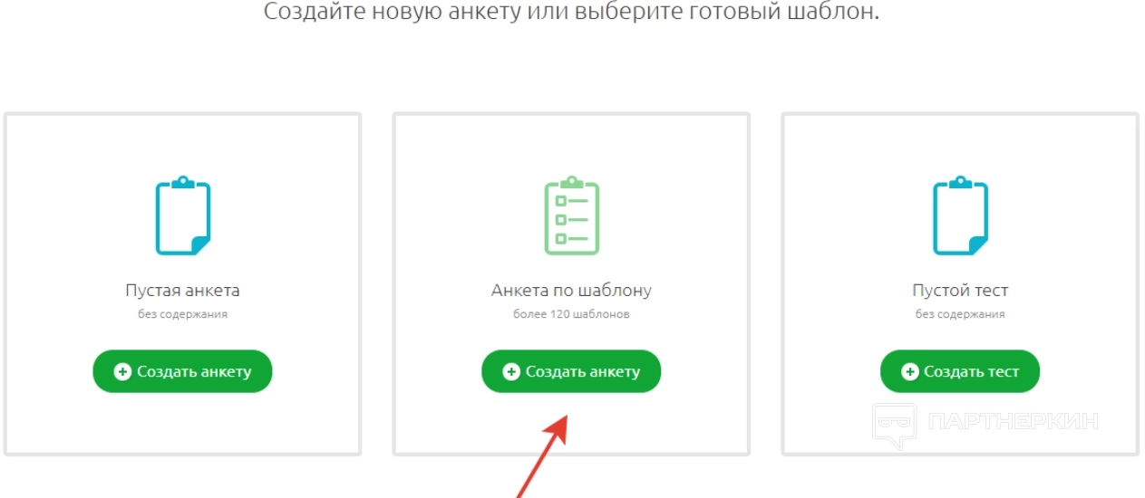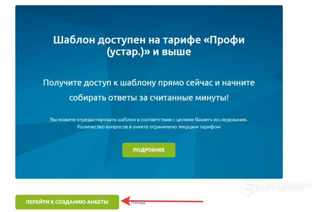 Если вебмастера устраивает шаблон, спускаемся в нижнюю часть экрана и жмем «Перейти к созданию анкеты». Обращаем внимание, что каждый шаблон прикреплен к отдельным тарифам.