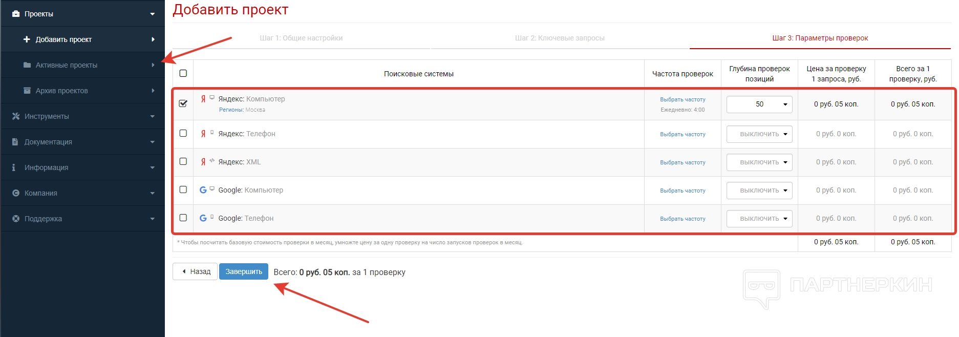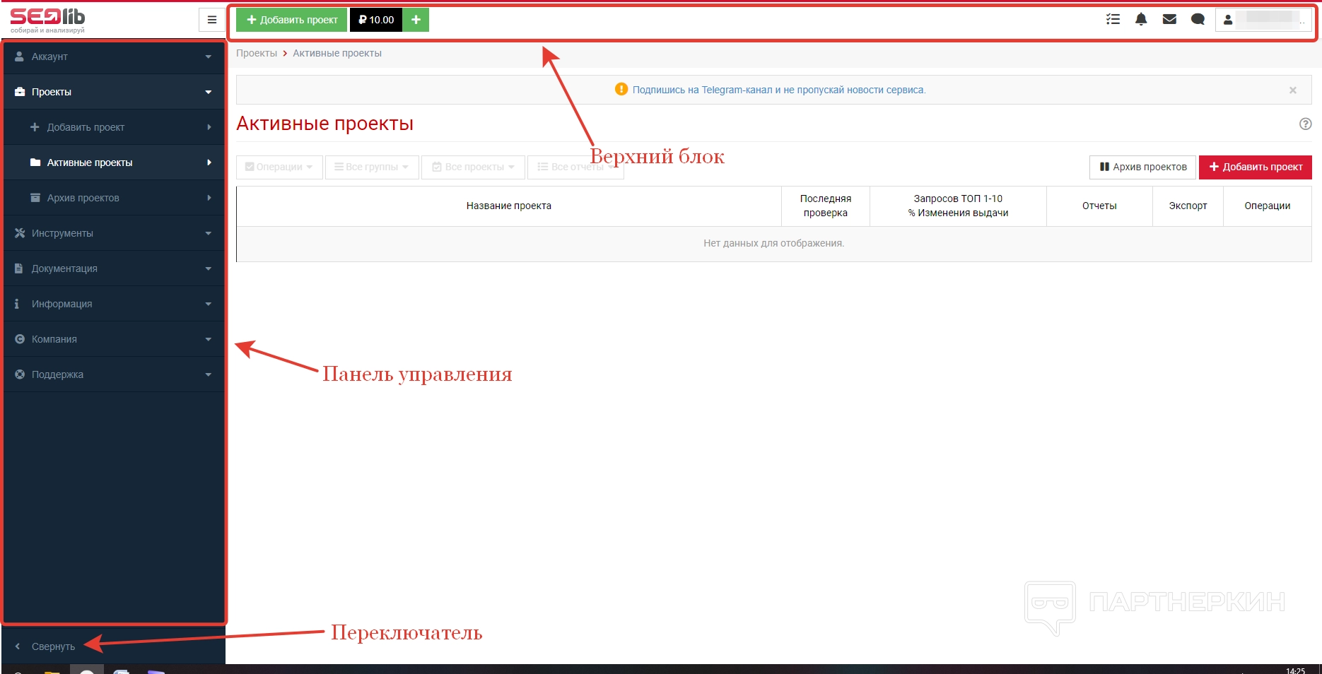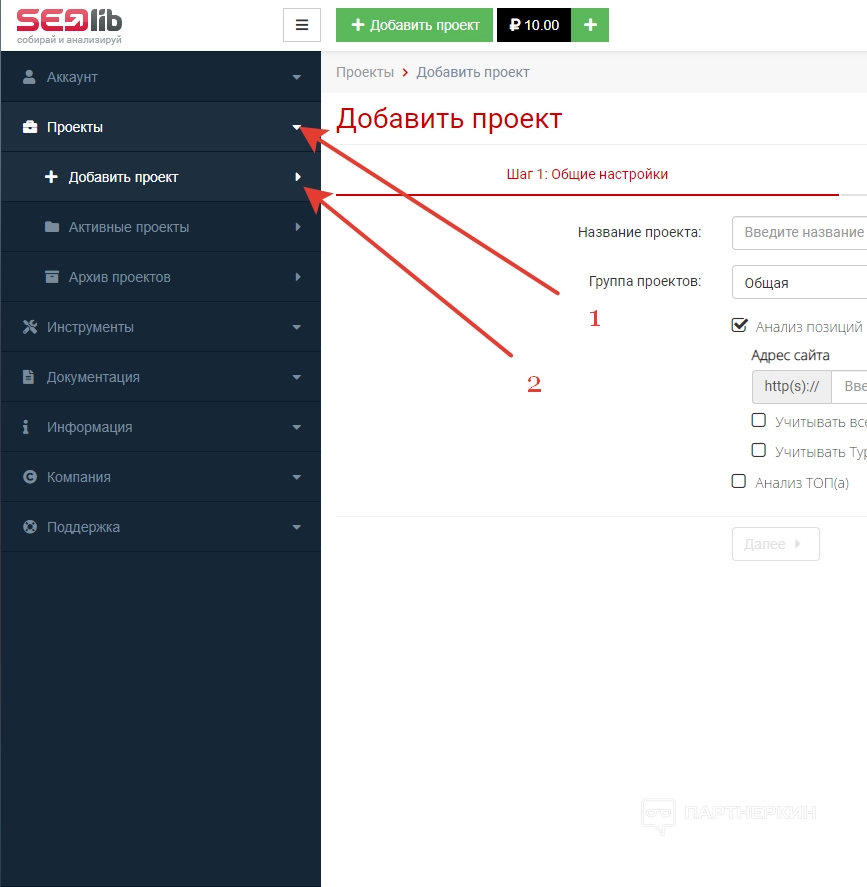 - проекты — здесь можно добавлять сайты для последующего проведения анализа;