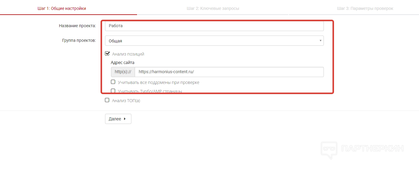 Подключение веб-ресурса состоит из нескольких этапов. На первом этапе нужно придумать название и указать группу, к которой будет относиться проект. По умолчанию система предлагает папку «Общая». Далее указываем URL-адрес и при необходимости ставим галочки напротив инструментов для учета поддоменов и Турбо/AMP-страниц.