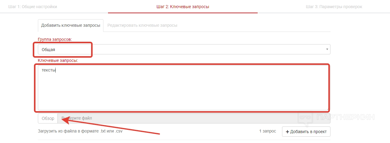 На следующем этапе нужно прописать ключевые слова. Как и в предыдущем случае, выбираем группу и в соответствующее окно указываем слова и фразы. При желании можно загрузить список со словами в файле, воспользовавшись специальной кнопкой.