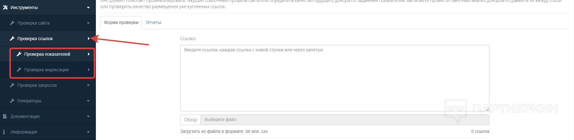 Следующий блок — «Проверка ссылок». Здесь можно проверять показатели профиля сайта и параметры индексации. При использовании инструмента «Проверка показателей» юзер можно сортировать показатели по следующим параметрам: