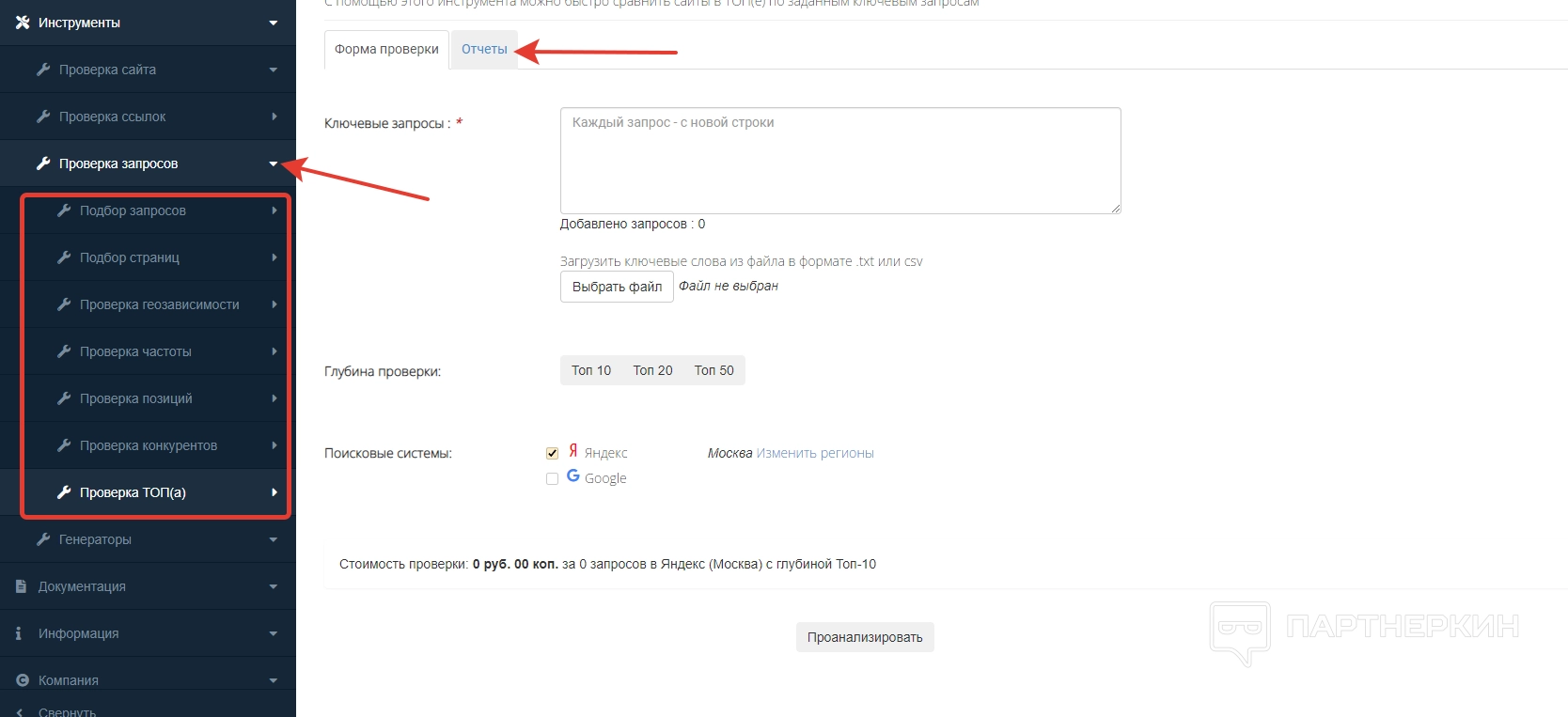 - инструменты — функционал для проверки сайтов, ссылок, запросов;