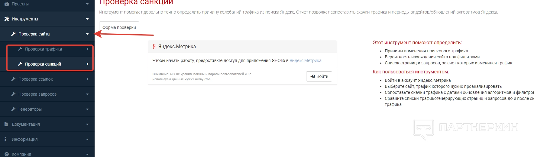 - Проверка санкций . С помощью данной функции пользователь в точности определит причину колебаний трафика из поисковой системы Яндекс. Потребуется доступ для сервиса в Яндекс.Метрике.