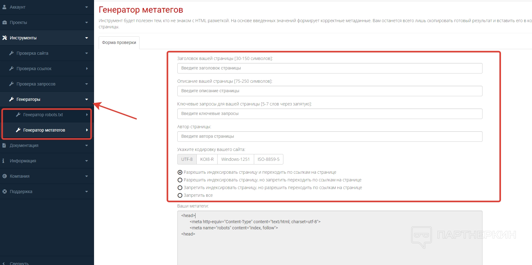 Последний блок — «Генераторы». В нем можно найти инструменты для генерации метатегов и создания файлов robots.txt. Последние генерируются в автоматическом режиме. Также с помощью этого инструмента можно настроить правила индексации для поисковых роботов.