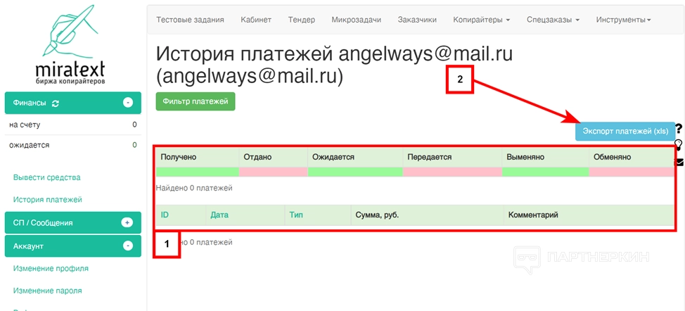 Во вкладке «История платежей» находятся все выполненные транзакции. Список можно сортировать по разным параметрам: дате, типу, ID и так далее (1). Также есть возможность выгрузить отчет в формате .xls (2).