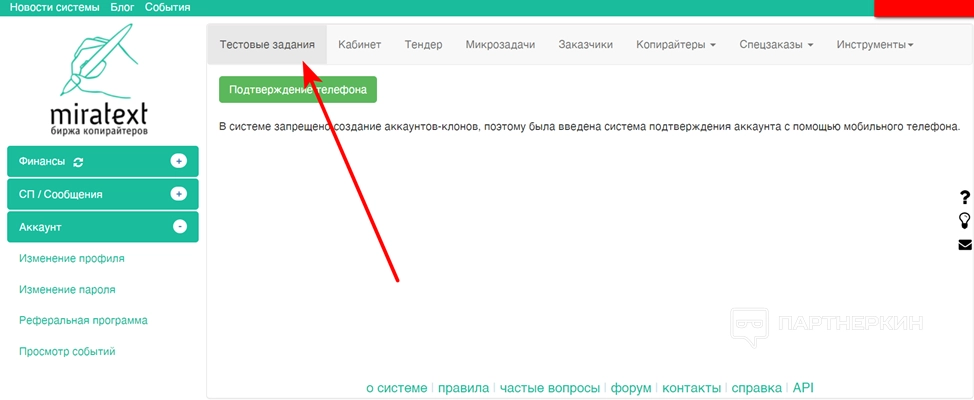 - Финансы . Показывает историю операций и возможность вывода денежных средств. Пока не пройдены тесты, доступ к заданиям закрыт. Следовательно — эти пункты бесполезны.