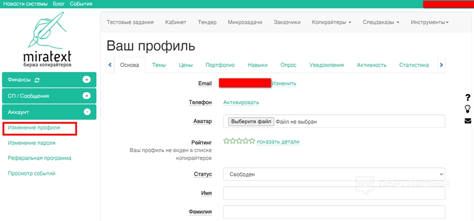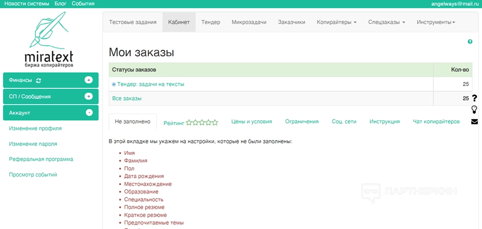 - Кабинет . Общая информация об авторе и бирже, условия работы и ограничения. Если какие-то условия не выполнены — это отобразится в поле «Не заполнено».