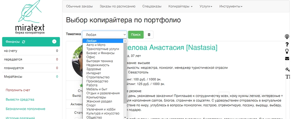 - По портфолио . Поиск авторов по тематике. Если в контекстном меню выбрать пункт «Любая», система высветит список всех исполнителей, но с подробным резюме. Конкретизируя направление, биржа показывает копирайтеров только по заданной теме.