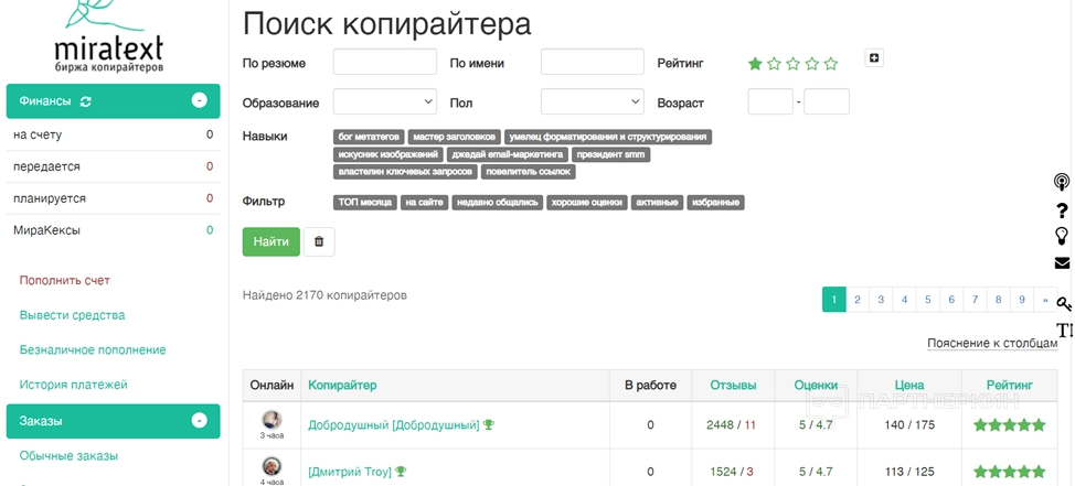 - Копирайтеры . Это поиск авторов по необходимым параметрам. Исполнители могут сравнить рейтинги, оценки и темы, которые они написали.