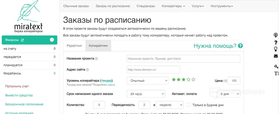 - Заказы по расписанию . Проекты будут создаваться автоматически по расписанию. Работа будет попадать в руки тому копирайтеру, который первый возьмется за работу.