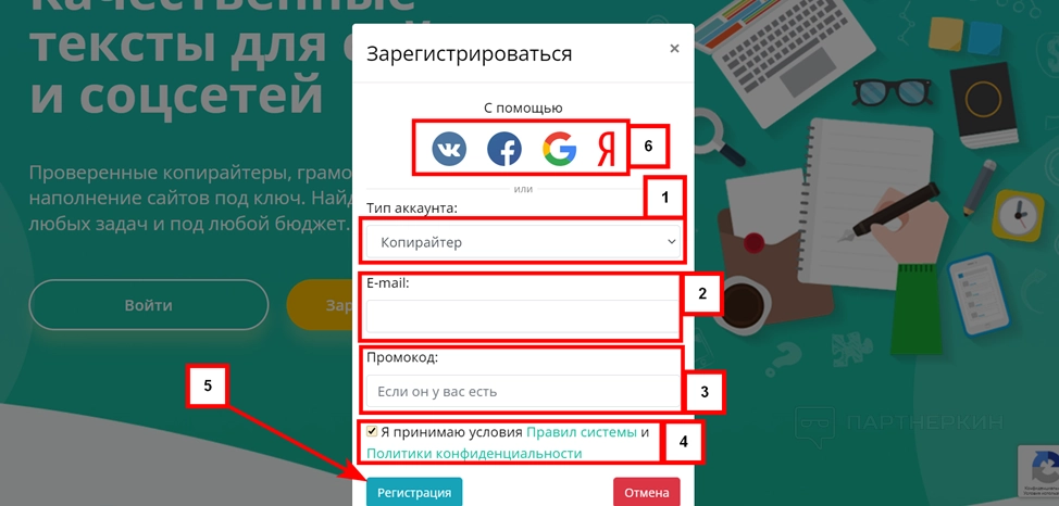 - Заполните форму. Укажите тип аккаунта (копирайтер или заказчик) (1), введите свой e-mail (2), введите промокод, если есть (3), поставьте галочку напротив «Я добавляю условия» (4).