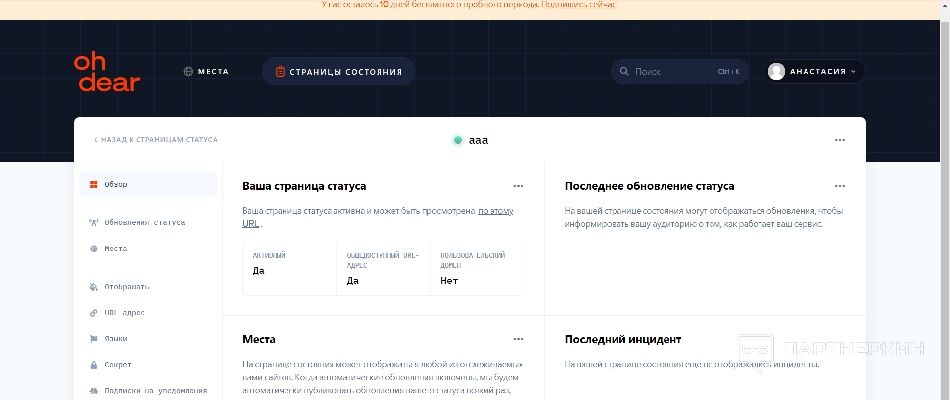 Можно увидеть, что на странице отображается общее состояние урла. Показывается также последнее обновление и последний инцидент, если он был. Если нужно страницу можно обновить в любой момент, а также корректировать по необходимости.