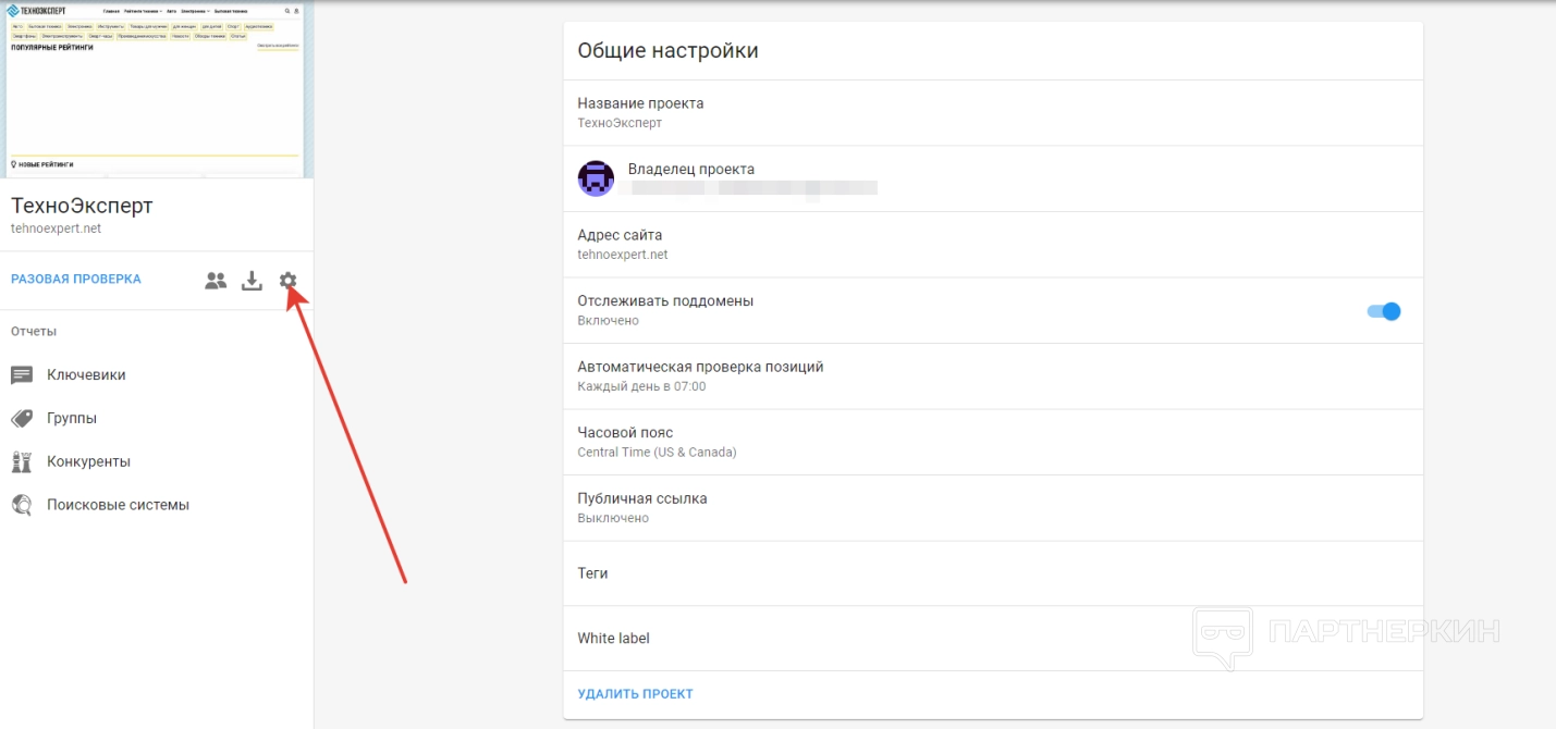 В добавленном проекте можно изменить настройки. Для этого жмем на значок с шестеренкой и попадает на страницу, где указаны: