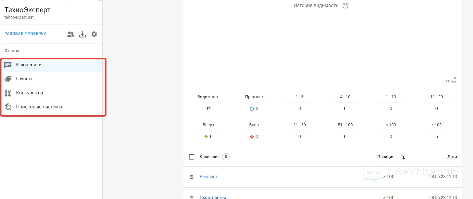 - ключевики — здесь отображается история видимости и статистика по указанным ключам;