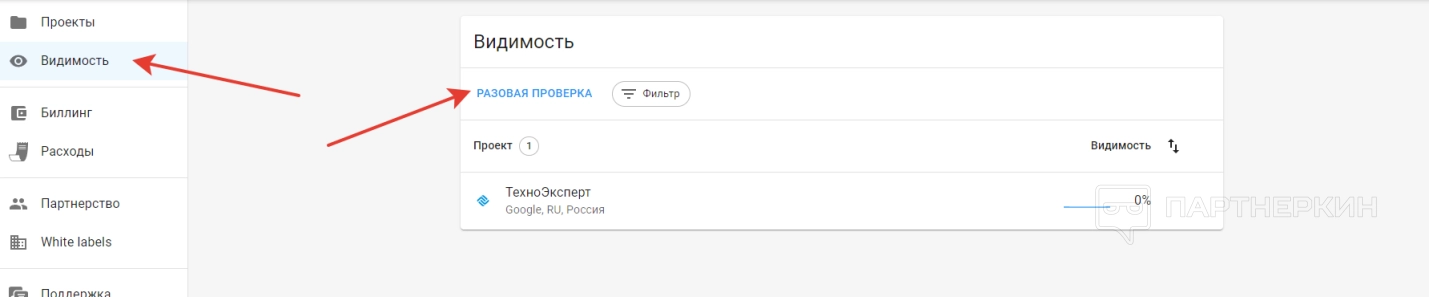 В панели управления есть раздел «Видимость», где пользователь может проводить разовые проверки позиций по ранее добавленным сайтам. Достаточно всего лишь нажать на соответствующую кнопку.